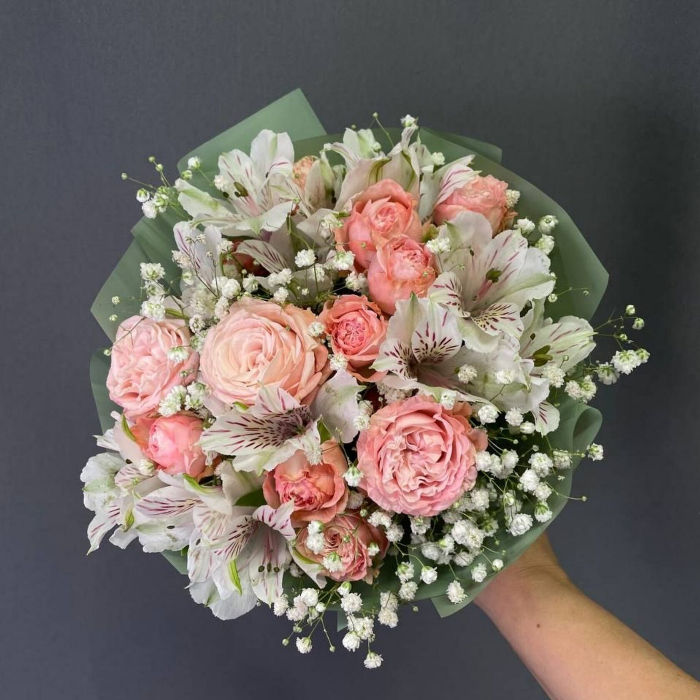 Букет-комплимент "Джекки". Букет-комплимент свободной постановки наполнен воздухом, романтизмом и светом. Стильный букет дополнен кустовой пионовидной розой, альстромерией и гипсофилой. Очень нежн...