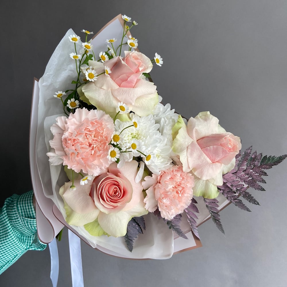 Сборный букет, выполненный в нежных розовых оттенках, покоривший не один десяток сердец 🌸 прекрасный способ выразить свои чувства и поднять настроение Вашим близким. В составе Роза, кустовая хризантема, Диантусы, матрекария и папоротник