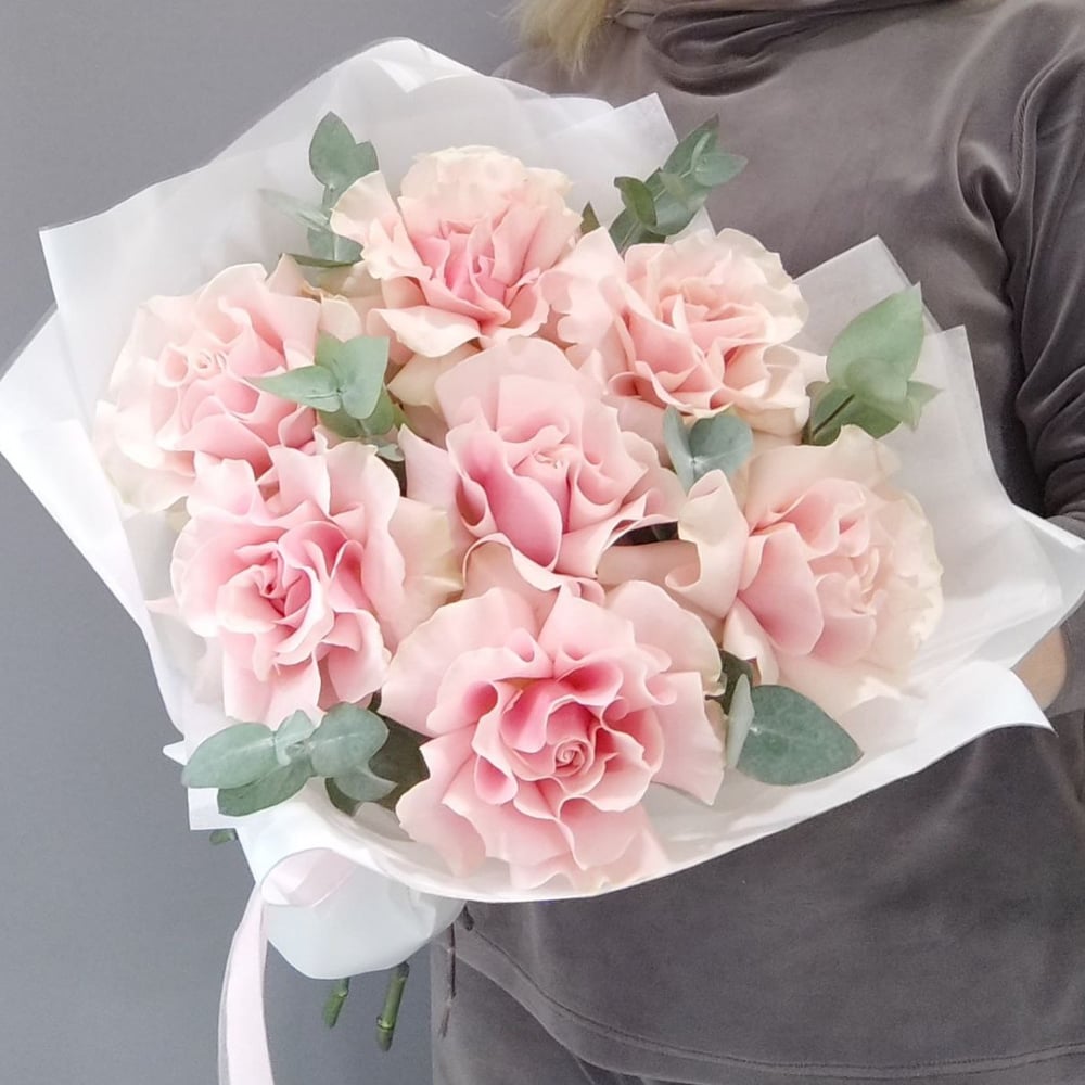 Нежнейший букет в розовой цветовой гамме с французскими розами сорта Пинк Мондиаль и эвкалиптом. Не забудьте подрезать цветы НЕПОСРЕДСТВЕННО перед тем как ставить в вазу (после подрезки в течении 2-3 секунд поставьте в воду). Не храните букет на прямых солнечных лучах и возле отопительных приборов, чтобы сохранить цветы свежими как можно дольше.