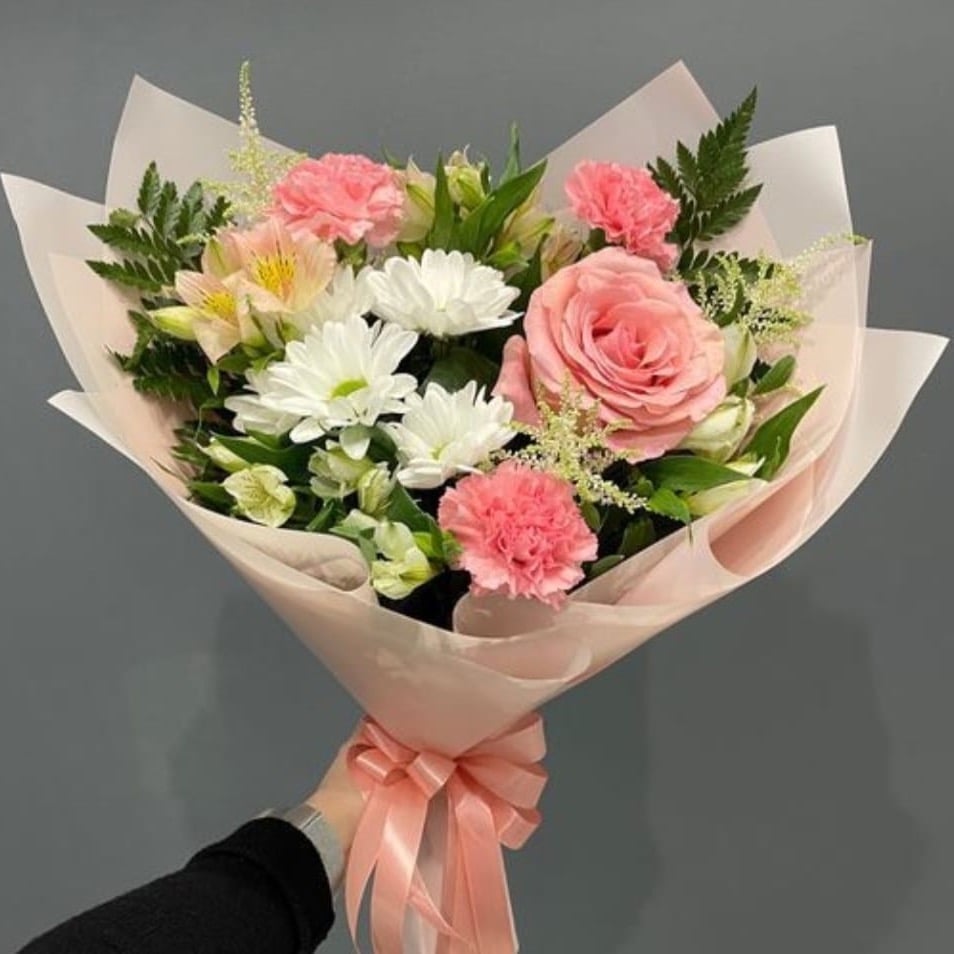 Букет с утонченным и романтическим составом – идеальный вариант для особого случая или для того, чтобы просто подарить радость близкому человеку. Розы являются воплощением красоты и чувственности. Их объемные, пышные соцветия великолепно сочетаются с нежностью других цветов в букете. Кустовая хризантема привносится лёгкость. Дополняют композицию удивительные альстромерии, которые создают впечатление легкости и воздушности. Пистация придаёт букету завершенность и уравновешенность.