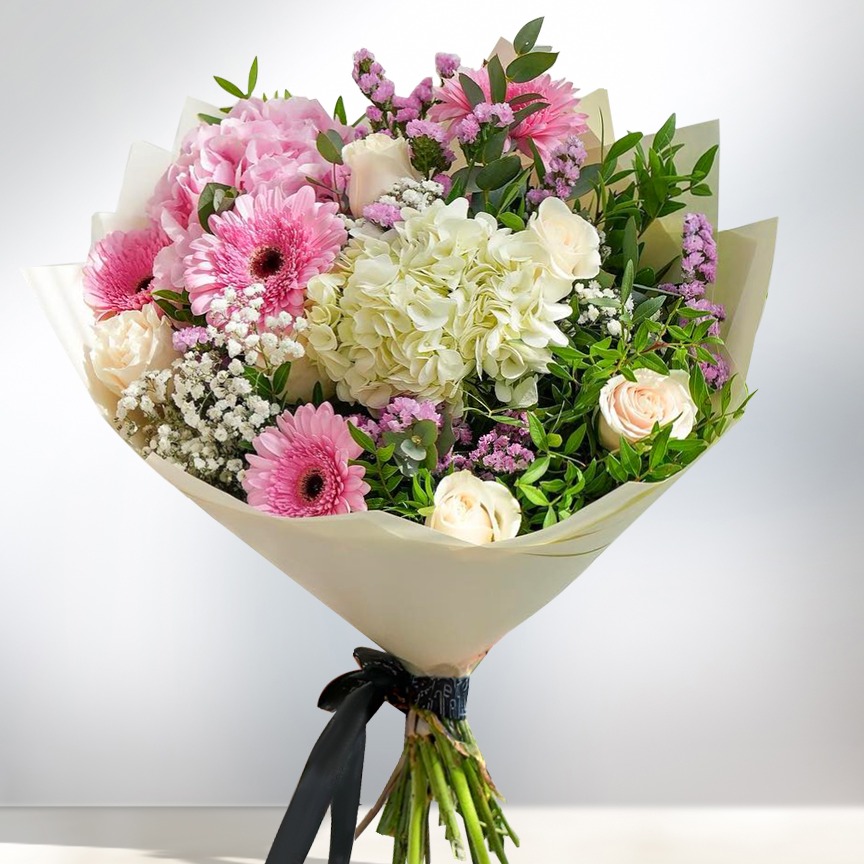 Букет состоит из розовой и белой гортензии, 5 белых роз, 4 розовых гербер с зеленью.