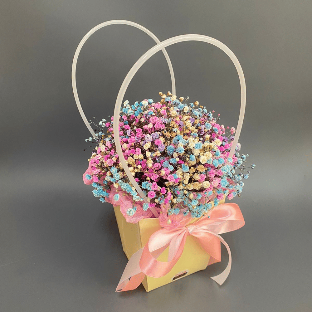 Гипсофила - нежный и воздушный цветок, который придает букету легкость и романтичность. Букет упакован в стильную сумочку, что делает его идеальным подарком для особого человека. Этот букет обещает принести радость и уют в любой дом.