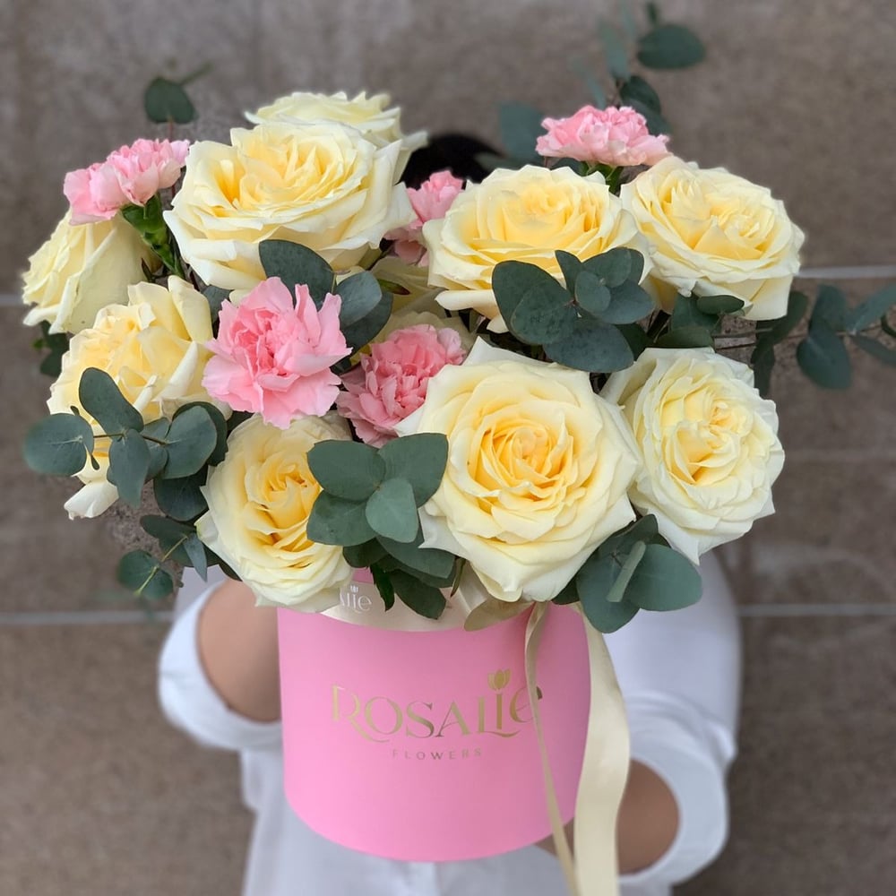 Шляпная коробка с цветами «Букет Глори» из роз и гвоздик
