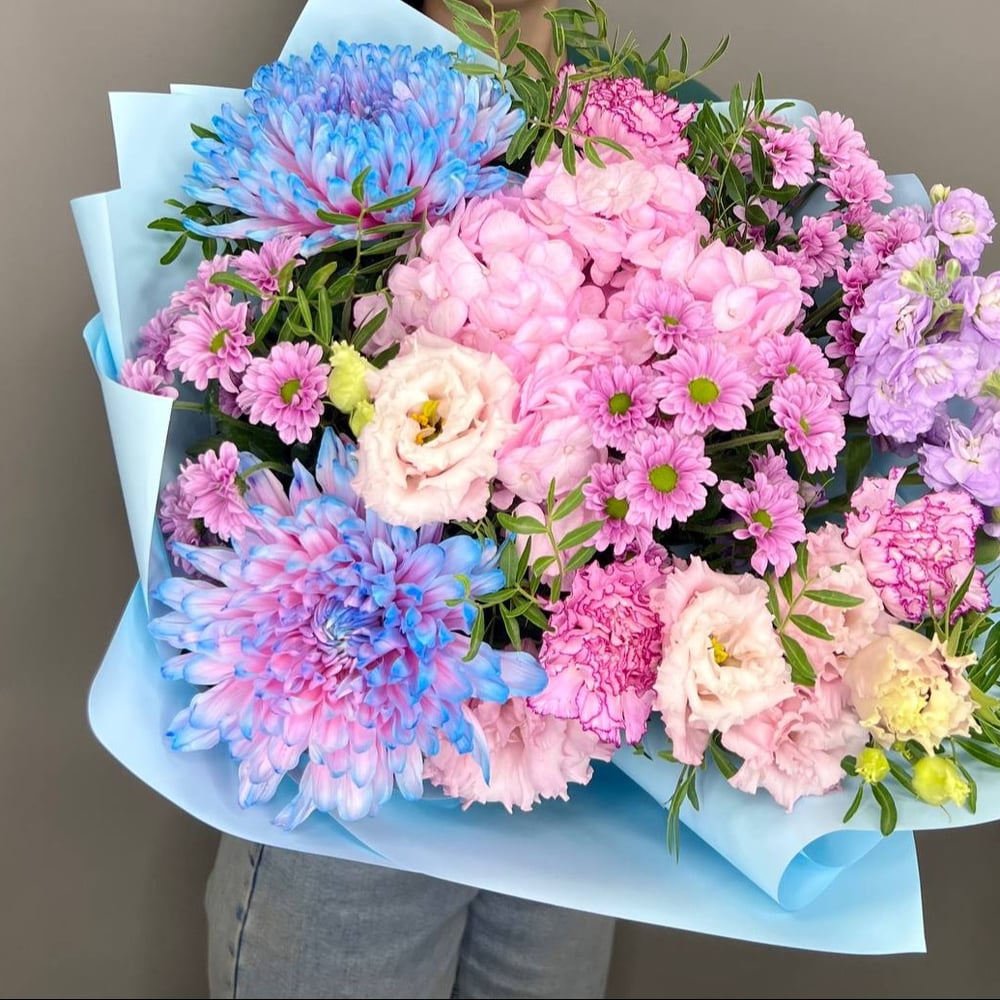 Букет голубая лагуна с гортензией из хризантем и гвоздик