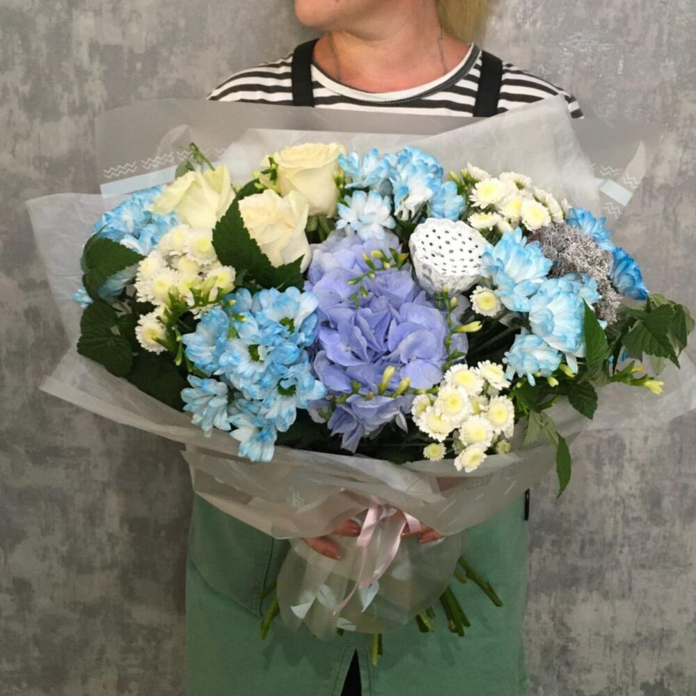 Состав Гортензия - 1 шт. Хризантема кустовая - 7 шт. Фрезия - 11 шт. Лотос - 1 шт. Малина - 6 шт. Роза Мондиаль - 3 шт. Самшит - 1 шт. Упаковка дизайнерская - 2 шт. Лента - 1 шт.