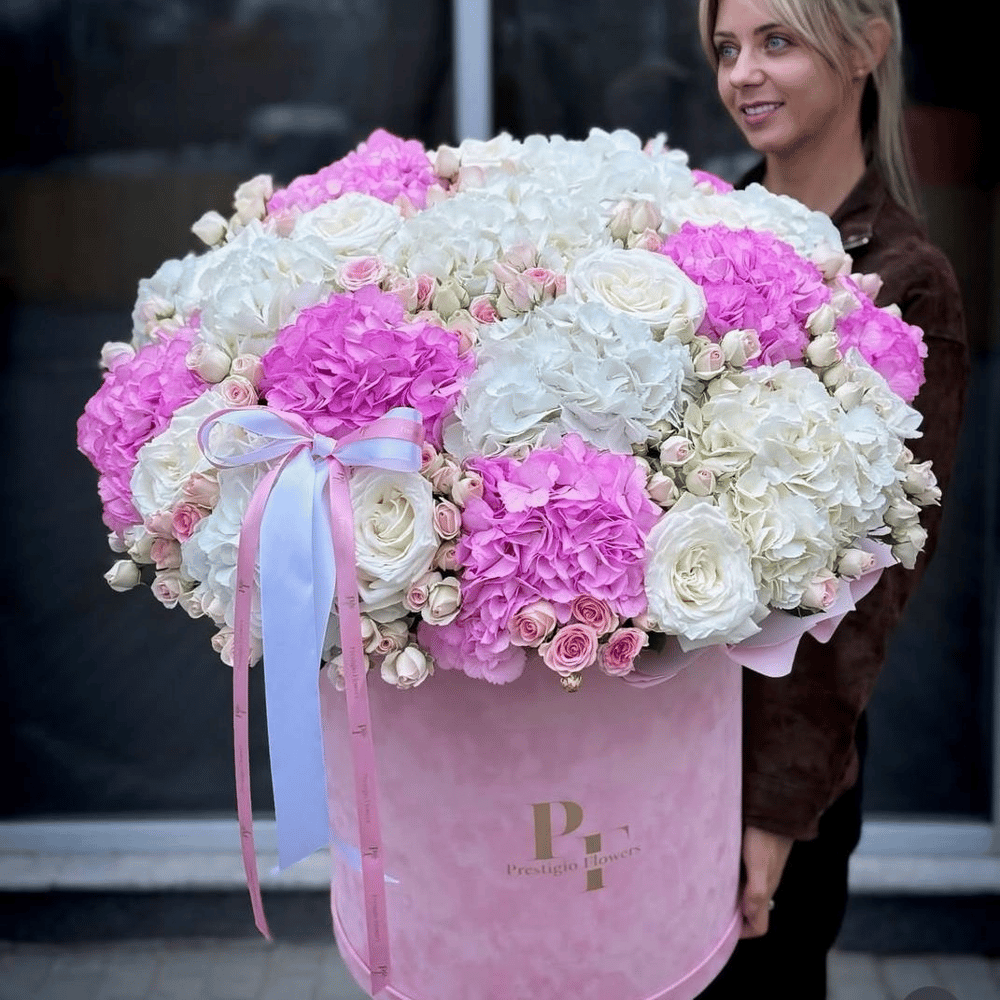 Шляпная коробка с цветами «Огромный короб Гортензий и кустовых роз»