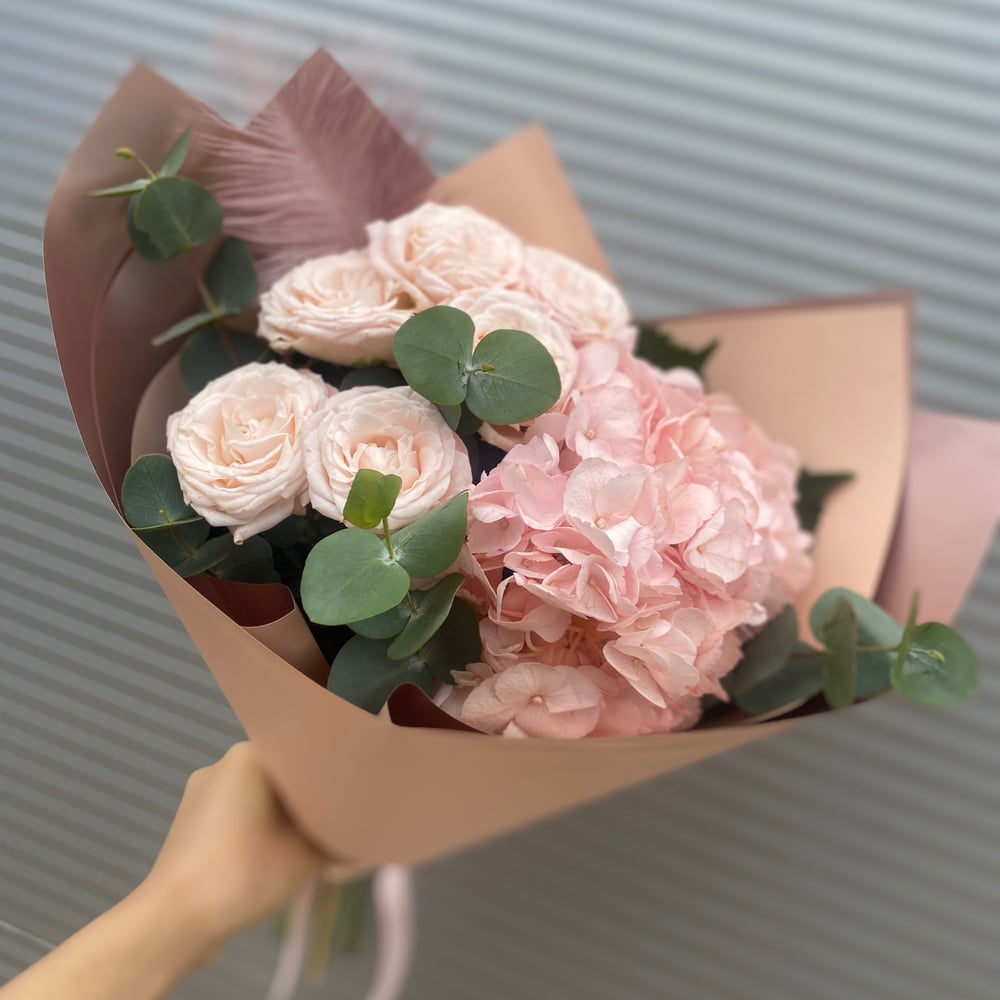 Гортензия с кустовыми розами и эвкалиптом