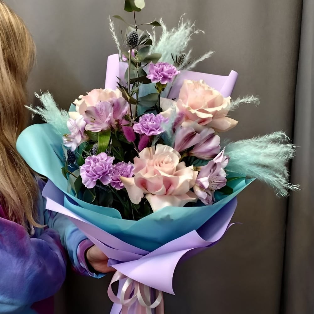 Букет "Grazia e Passione," что в переводе с итальянского означает "Грация и страсть," был создан для романтических душ, которые ценят красоту жизни и живут с горячей страстью к путешествиям. Этот изысканный цветочный арсенал, собранный с вниманием к деталям и любовью к каждой ноте, словно открывает дверь в мир, где каждое мгновение полнится яркими эмоциями и новыми открытиями. Каждый элемент букета "Grazia e Passione" создан так, чтобы порадовать не только глаз, но и душу. Он становится не просто подарком, а настоящим манифестом чувств, идеальным для тех, кто понимает наслаждение в жизни через призму страсти и грации. Размер: Диаметр 45 см., высота 50 см. ⠀ Состав: мискантус - 3 шт., роза Mondial Pink - 3 шт., диантус - 5 шт., альстромерия - 2 шт., эрингиум - 1 шт., эвкалипт - 1 шт., рускус - 1 шт., лагурус - 3 шт., упаковка, ленты