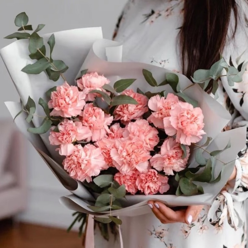 Букет в упаковке с ключевым акцентом на 15 нежных гвоздик. Гвоздика — очень многозначный цветок. Все впитали его кружевные лепестки: и нежность, и любовь, и воинскую честь, и славу. В этом его прелесть. Ветви эвкалипта подчёркивает красоту роз и добавляют букет свежести и оригинальности. Упаковка дополняет элегантность букета и защищает цветы от повреждений во время доставки. Этот букет будет идеальным подарком, который дарит тепло и улыбку своему получателю.