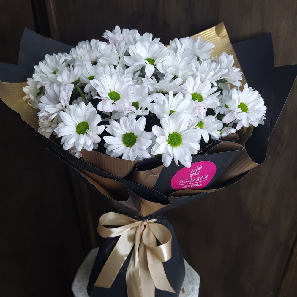 Хризантема кустовая белая, оформлена в дизайнерской бумаге.