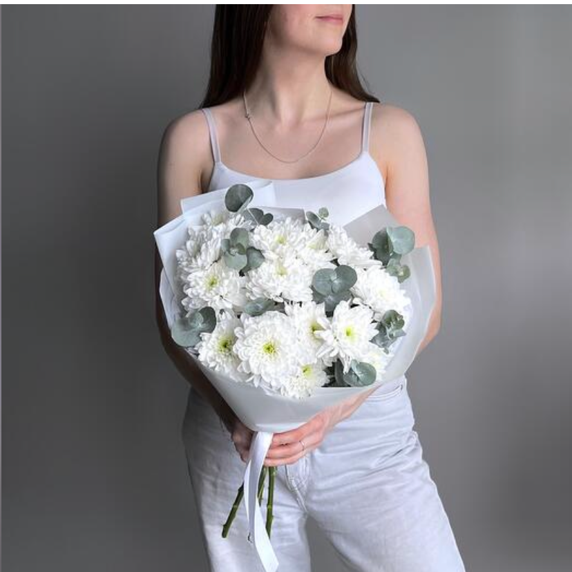 Букет хризантем сорта Алтай с эвкалиптом