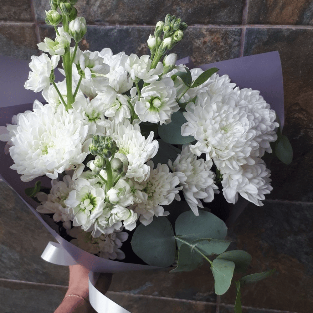 Букет в белых тонах с ароматной маттиолой подарит хорошее настроение и порадует любого получателя!