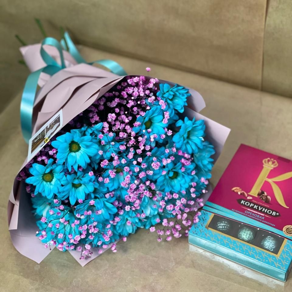 Букет из стойких хризантем и конфет подарит хорошее настроение и порадует любого получателя!