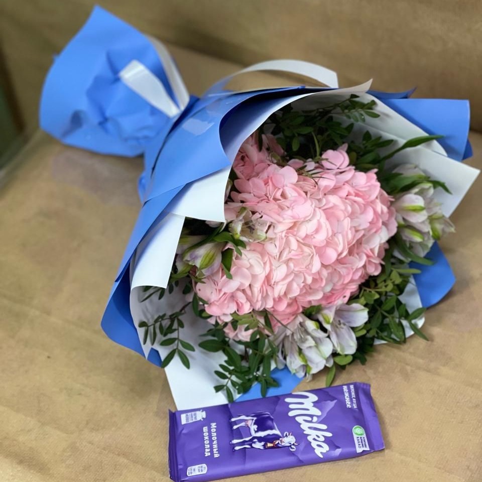 Букет из гортензии и шоколад подарят хорошее настроение и порадуют любого получателя!