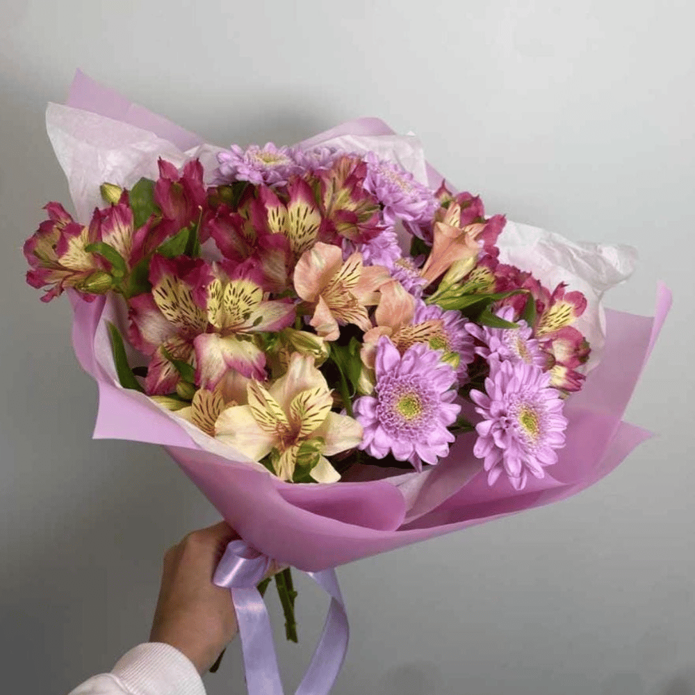 Этот изысканный букет состоит из нежных хризантем и альстромерий, создавая красивое сочетание цветов и текстур. Упаковка добавляет нотку элегантности и завершает образ композиции. Букет будет прекрасным подарком для любого случая и порадует своей красотой и свежестью.
