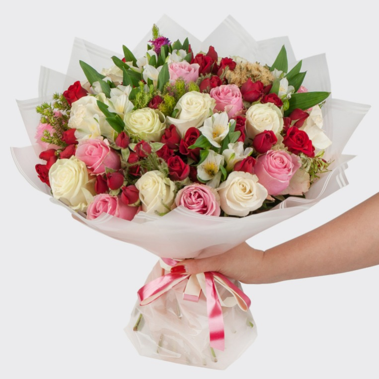 Очаровательный презент для самой нежной и прекрасной особы - букет из белых, розовых и красных роз, расцвеченных уточенными альстромериями и свежей декоративной зеленью. Завершающий штрих - стильная многослойная упаковка из белой бумаги и ленточка в тон прекрасным цветам.