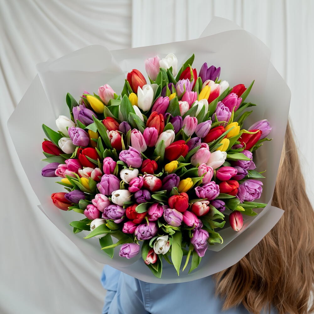 Состав: упаковка - 1 шт, тюльпаны - 101 шт. Размер: ширина - 50 см, высота - 50 см.