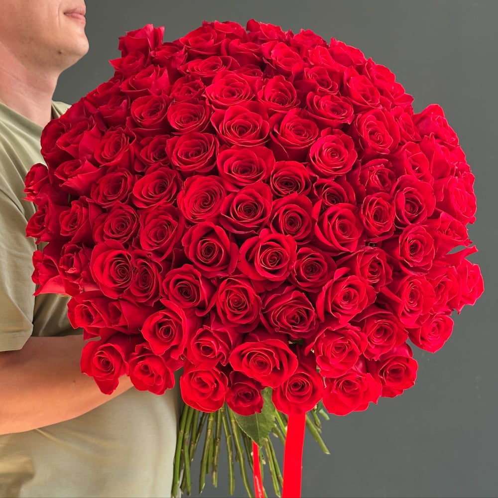 Сто один алый шелк лепестков, сплетённых в симфонию вечного чувства — этот монументальный букет есть сама любовь, воплощённая в цветах. Каждая роза с идеальным бутоном и длинным крепким стеблем рас...