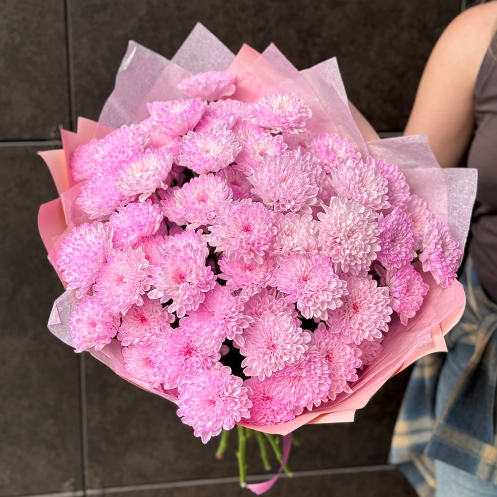 Нежный монобукет из стойких кустовых хризантем в стильной упаковке