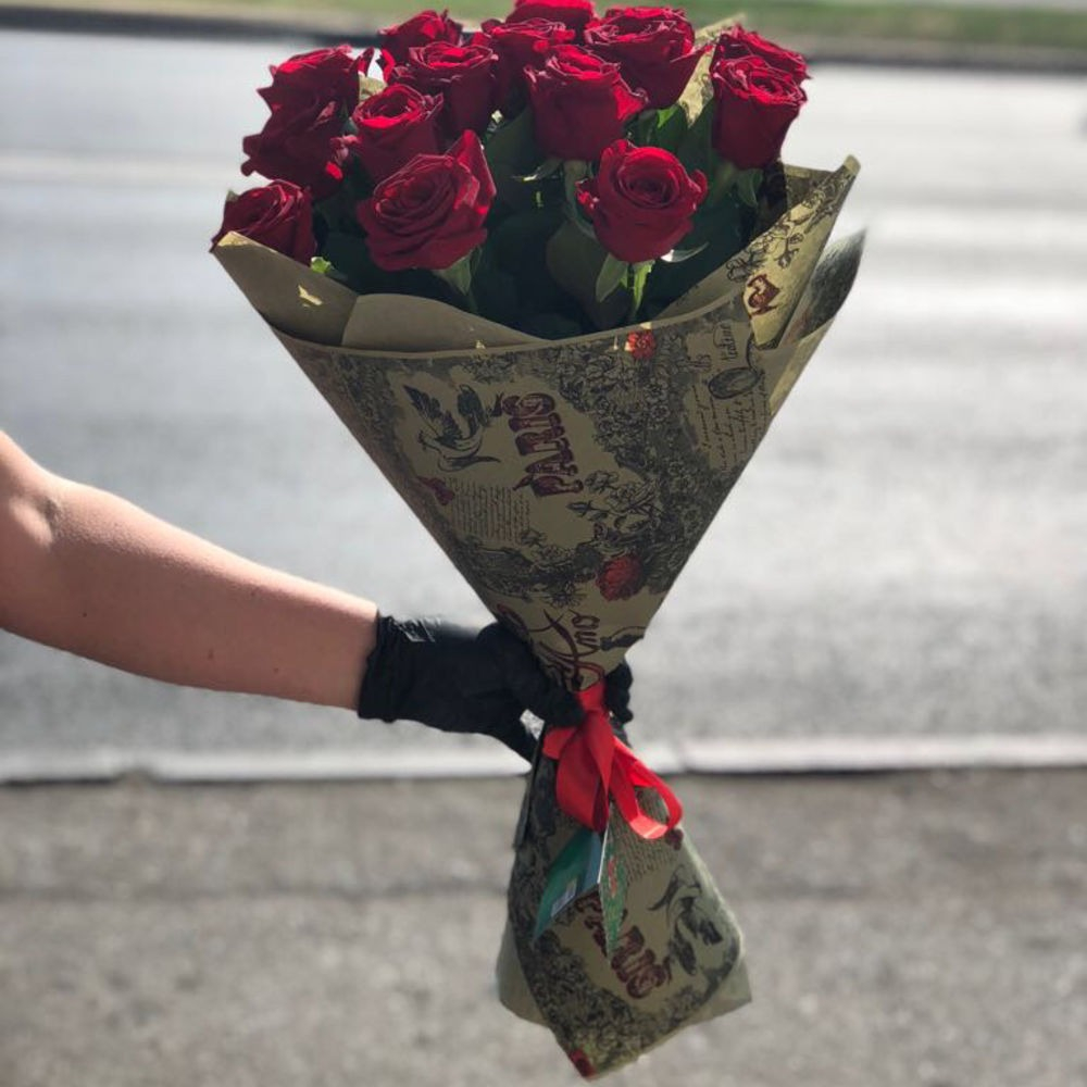 Букет из роз, оформленные в фирменную упаковку и перевязан лентой.