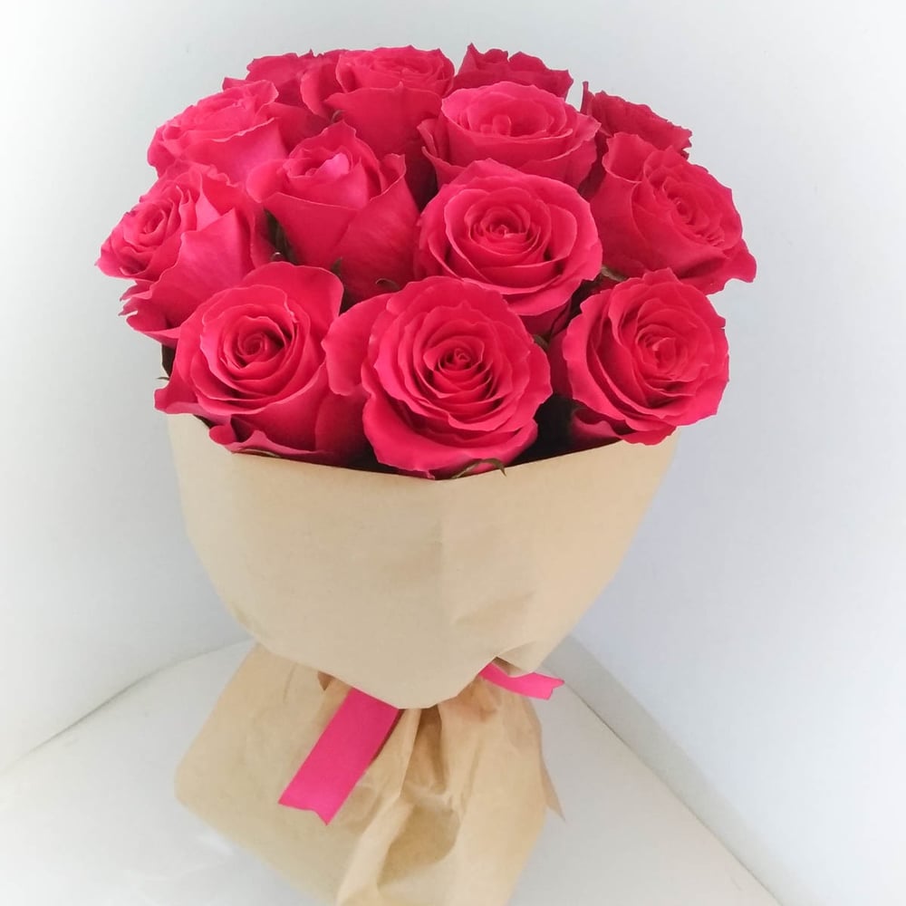 Букет из роз, оформленные в фирменную упаковку и перевязан лентой.