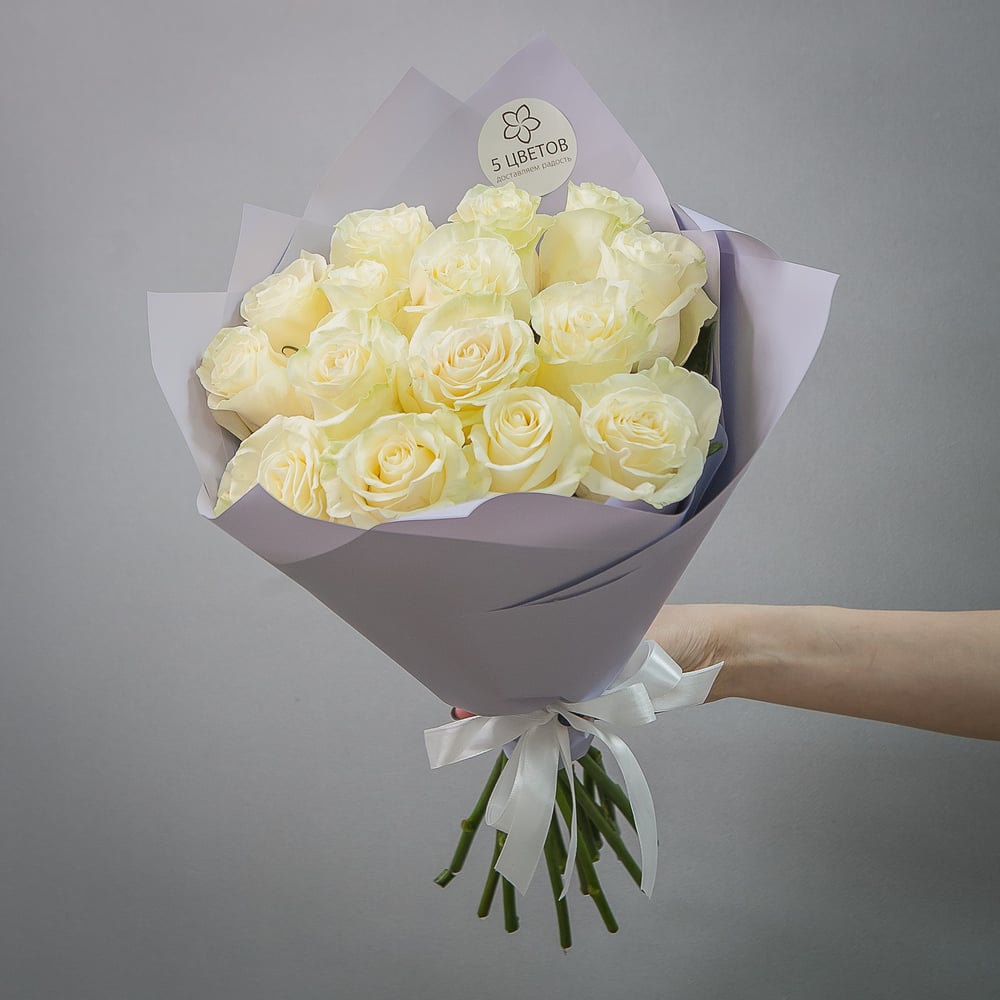 Состав букета: Розы белые- 15 шт. Упаковка матовая пленка Атласная лента. Арт: 36