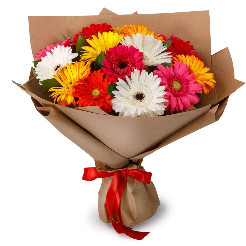 Разноцветный ансамбль из гербер - это пожелание счастья, радости, благополучия, улыбок и позитива! Сочный красочный букет подарит яркие и положительные эмоции!