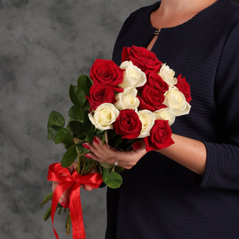 Классический букет из 15 красных и белых роз. Сорт: Ред Наоми, Аваланж Упаковка: лента.