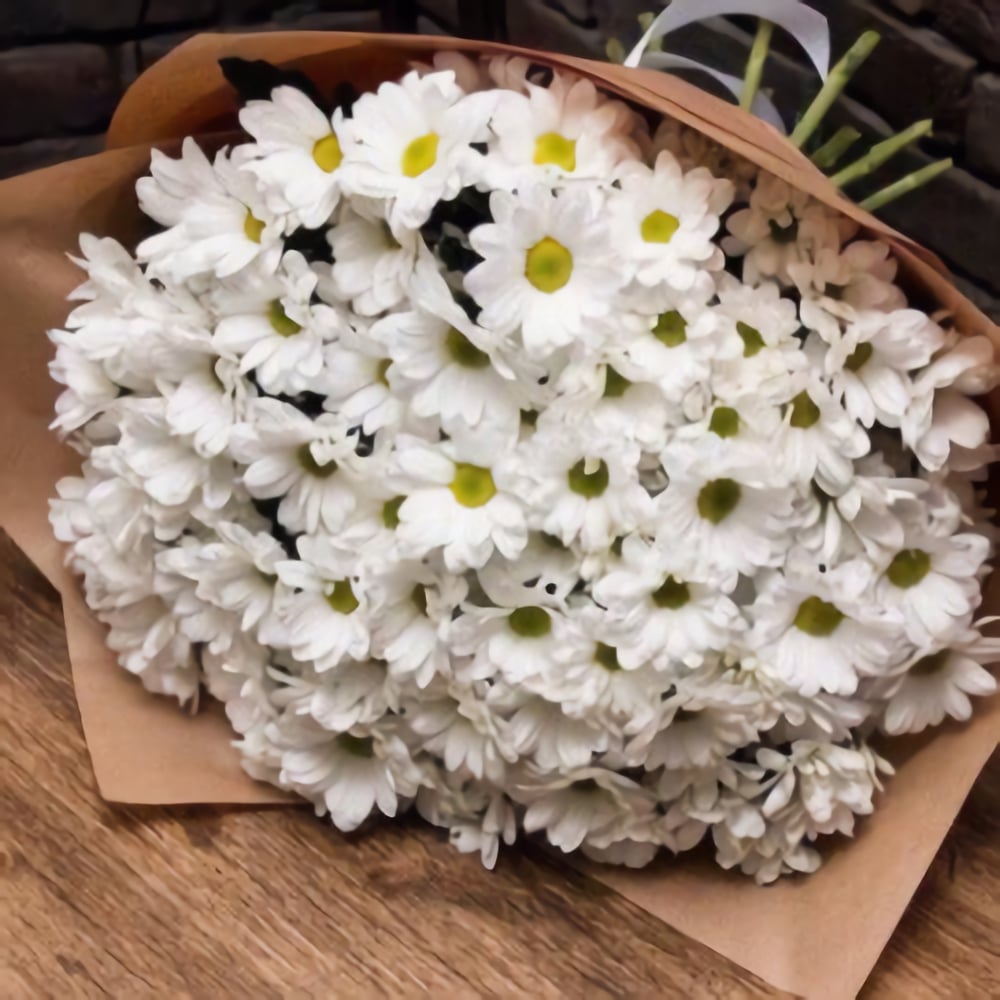 Трогательная и чистая красота заключена в букете из белых хризантем, так похожих на самый нежный полевой цветок - ромашку. Хрупкие белые цветы символизируют радость и доброту, с помощью этих очаровательных цветов Вы сможете выразить самые теплые и душевные пожелания близкому человеку или признаться в искренней любви Вашей избраннице.