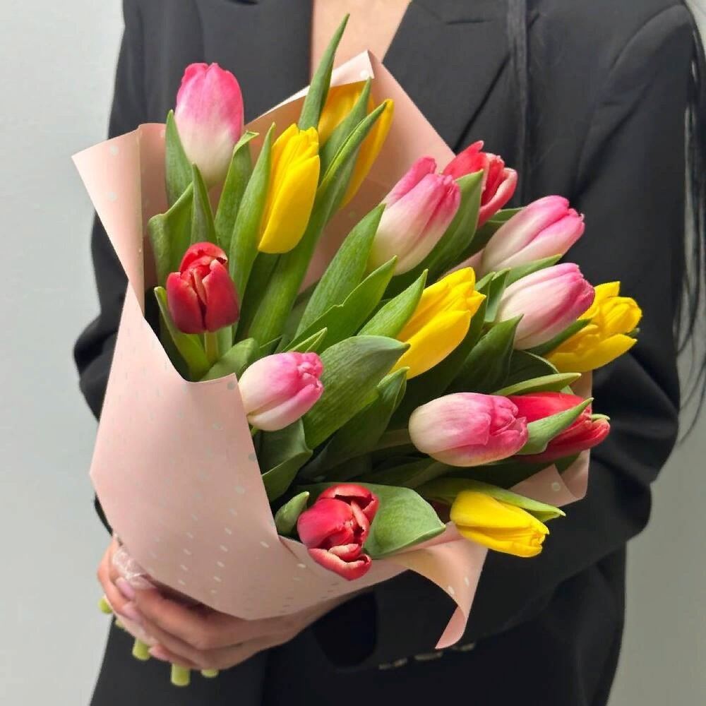 Весенний букет из 15 разноцветных тюльпанов в милой упаковке