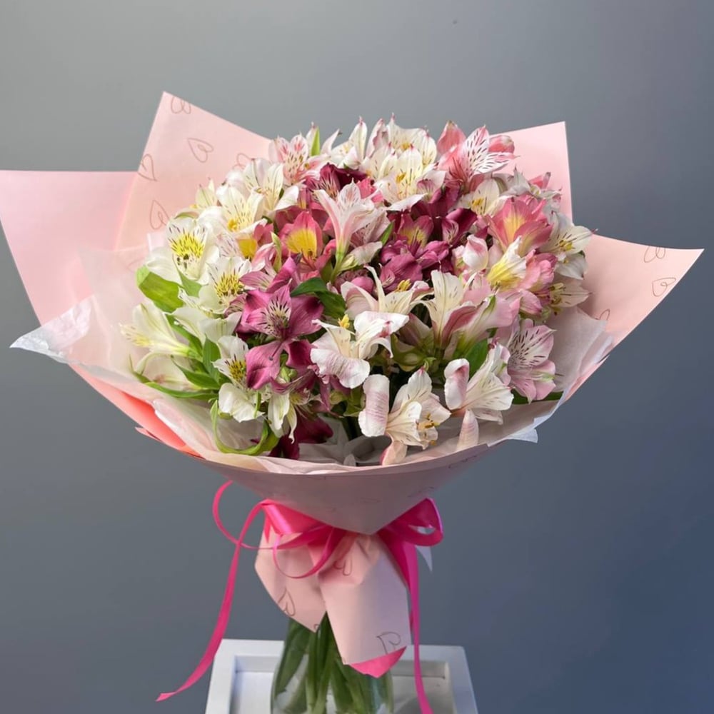 Яркий и красивый букет из 19 альстромерий порадует своими нежными лепестками и яркими оттенками. Благородная упаковка из тишью и ленты добавляет особое очарование этому цветочному составу, делая его идеальным подарком для любого праздника или повода.