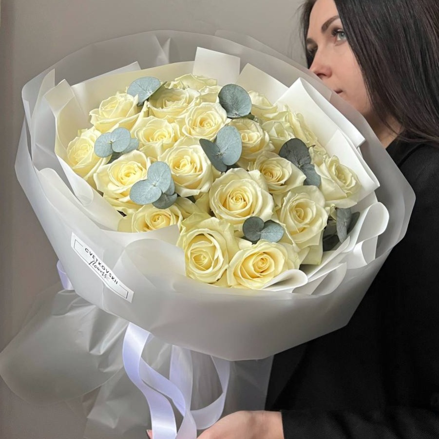 Моно букет из 21 белой розы с добавлением эвкалипта