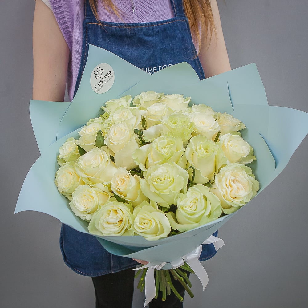 Состав букета: Розы белые- 25 шт. Упаковка матовая пленка Атласная лента.