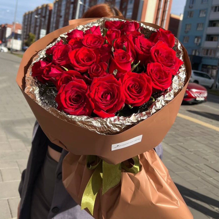 Этот роскошный букет из 25 красных роз упакован в стильную авторскую упаковку. Каждая роза прекрасно дополняется лентой и фольгой, создавая изысканный внешний вид. Этот букет станет идеальным подарком для особого случая или просто как проявление заботы и внимания к близкому человеку.