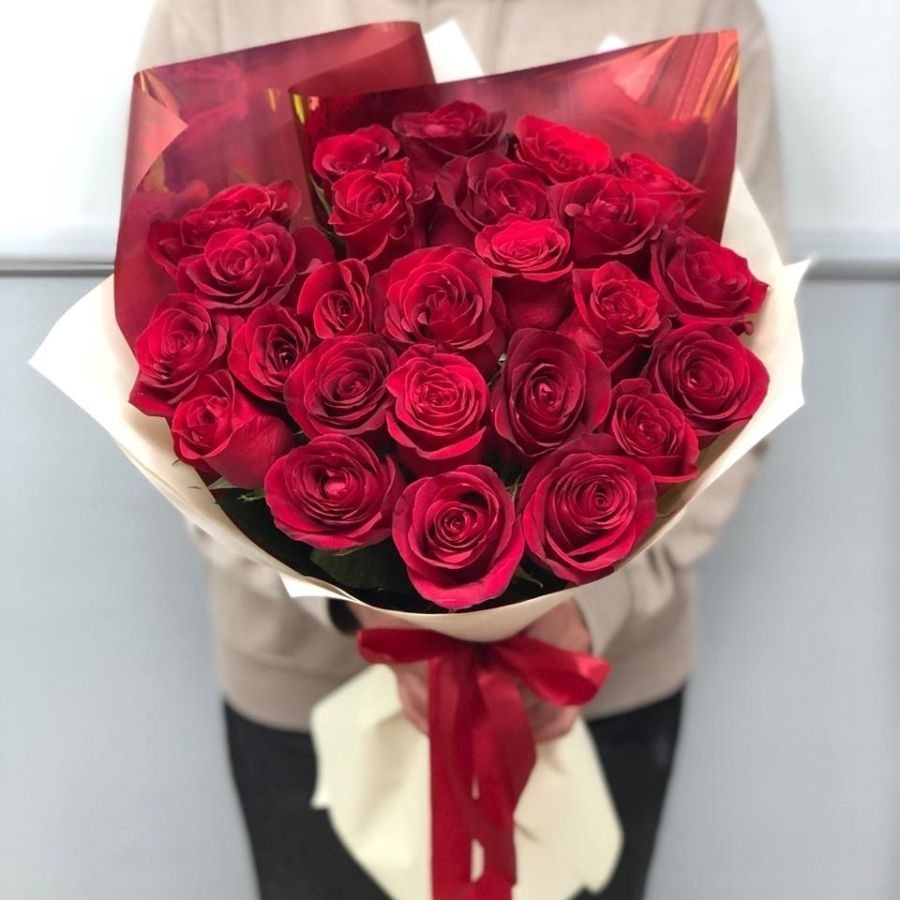 Букет из 25 красных роз в декоративной упаковке — отличный подарок на любое мероприятие, презент коллеге или признание любимым.