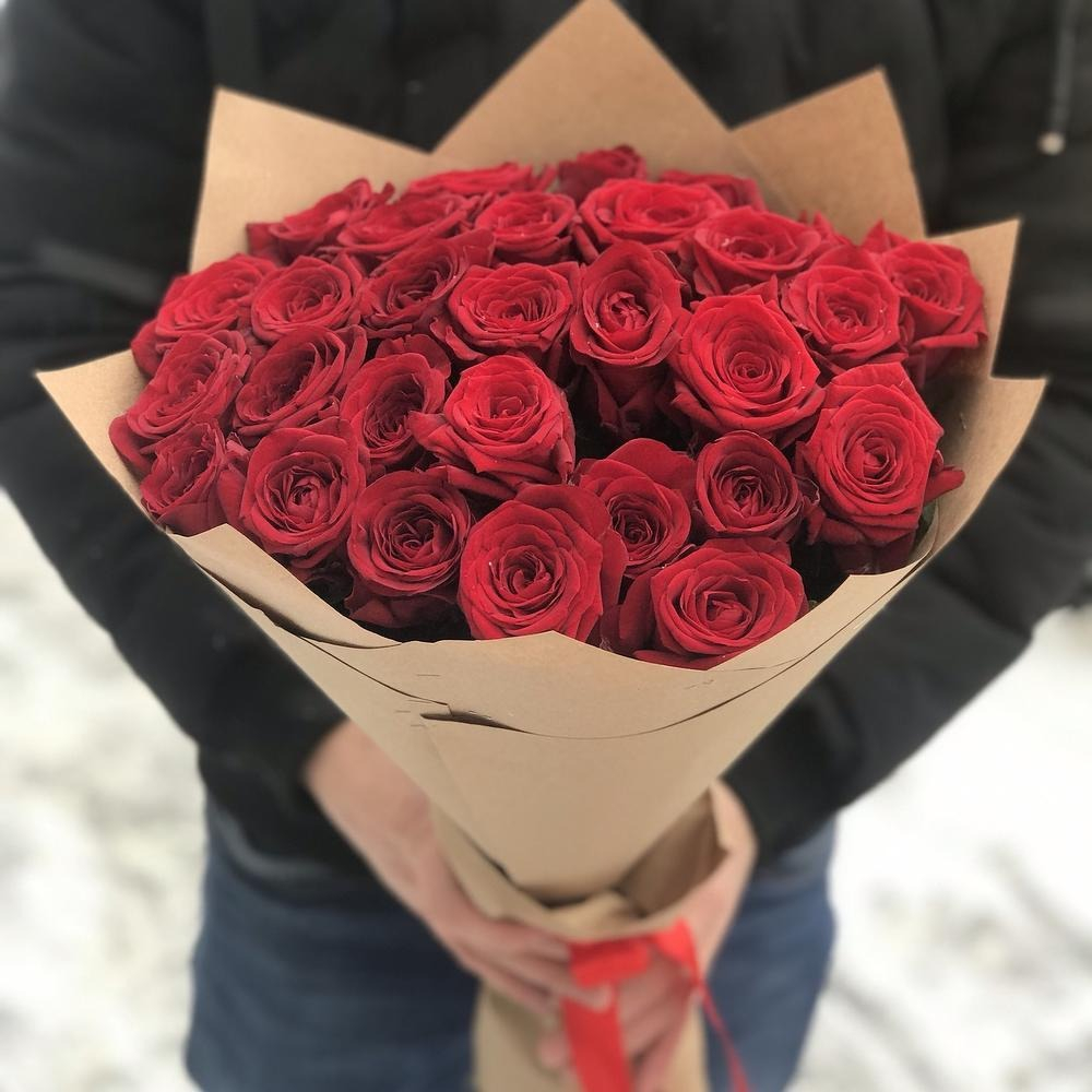 Букет из роз, оформленные в фирменную упаковку и перевязан лентой.