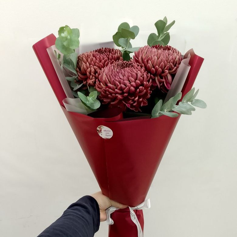 Очаровательный букет из хризантем сорта Бигуди, известных своими кудрявыми лепестками, в сочетании с ароматным эвкалиптом. Элегантная упаковка подчеркивает уникальность и изящество этого неповторимого подарка.
