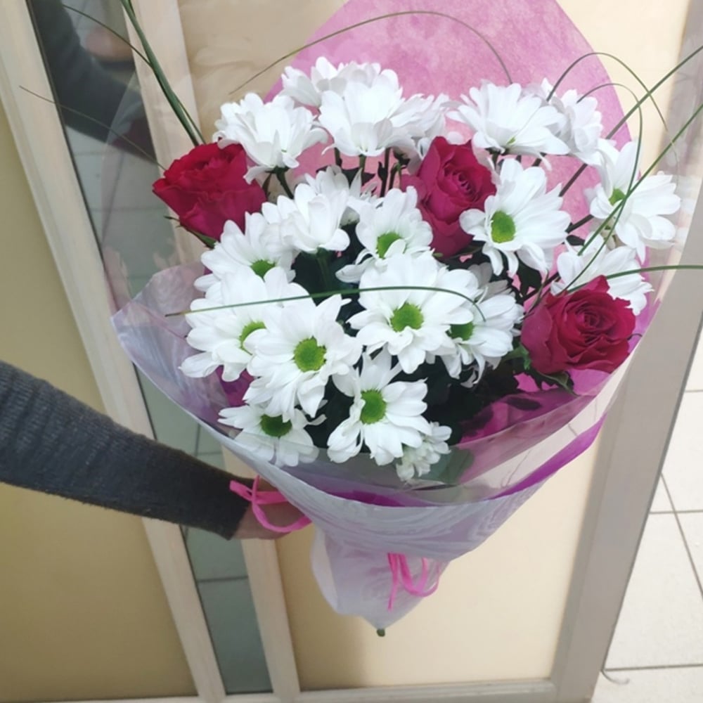 Букет из 3 розовых роз и 3 хризантем