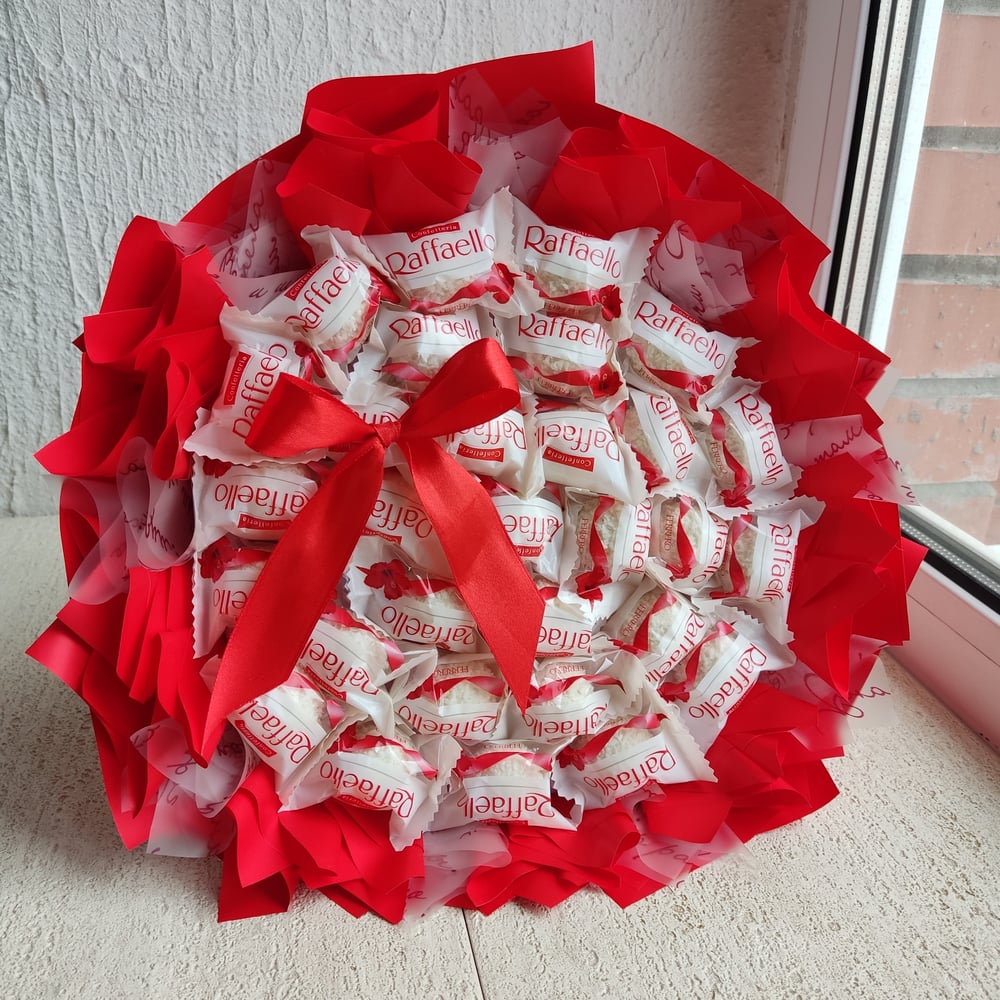 Оригинальный букет из 30 конфет Рафаэлло Приятно удивит и подарит сладкое настроение Упаковка конфет не нарушена Сверху букет дополнительно упакован в прозрачную пленку.