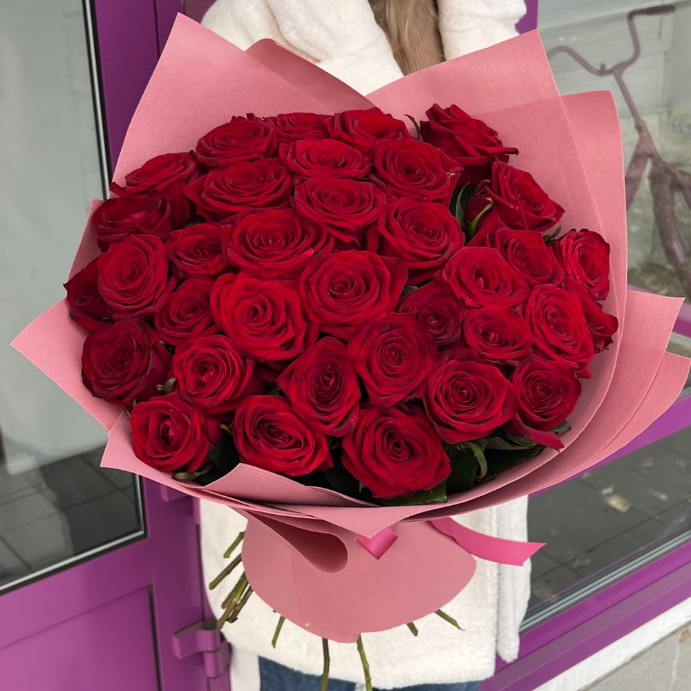 Объёмный букет из красных крупных роз в стильной упаковке.