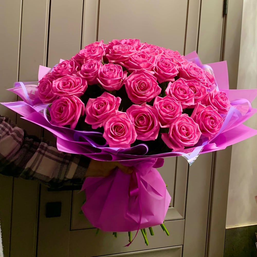 Букет из 31 розы с оформлением в дизайнерскую бумагу