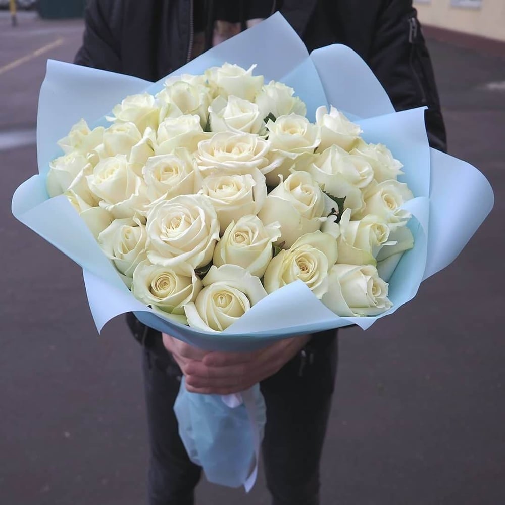 Букет из роз, оформленные в фирменную упаковку и перевязан лентой.