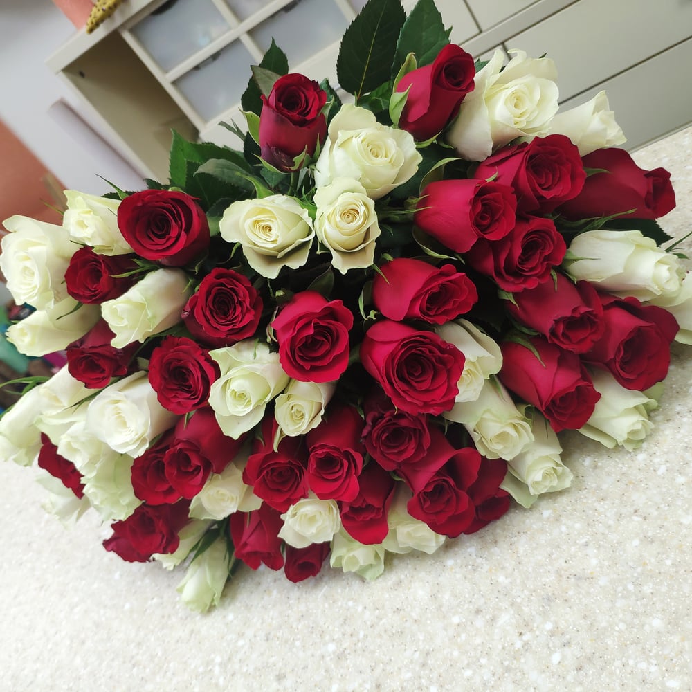 Букет из 35 белых и красных роз