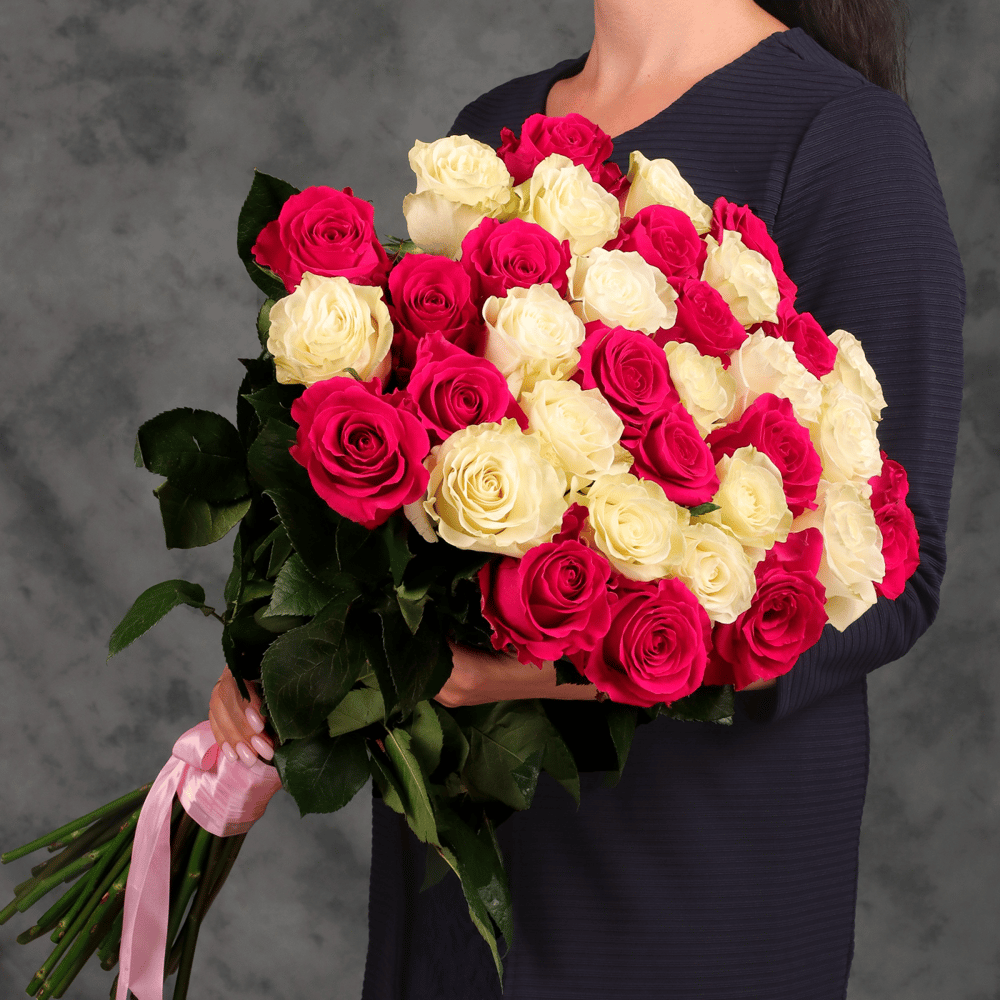 Классический букет из 35 белых и розовых эквадорских роз 60 см с атласной лентой от 2name flowers букет состоит из 35 белых и розовых эквадорских роз сорта мондиаль и пинк флойд. Розы упакованы…