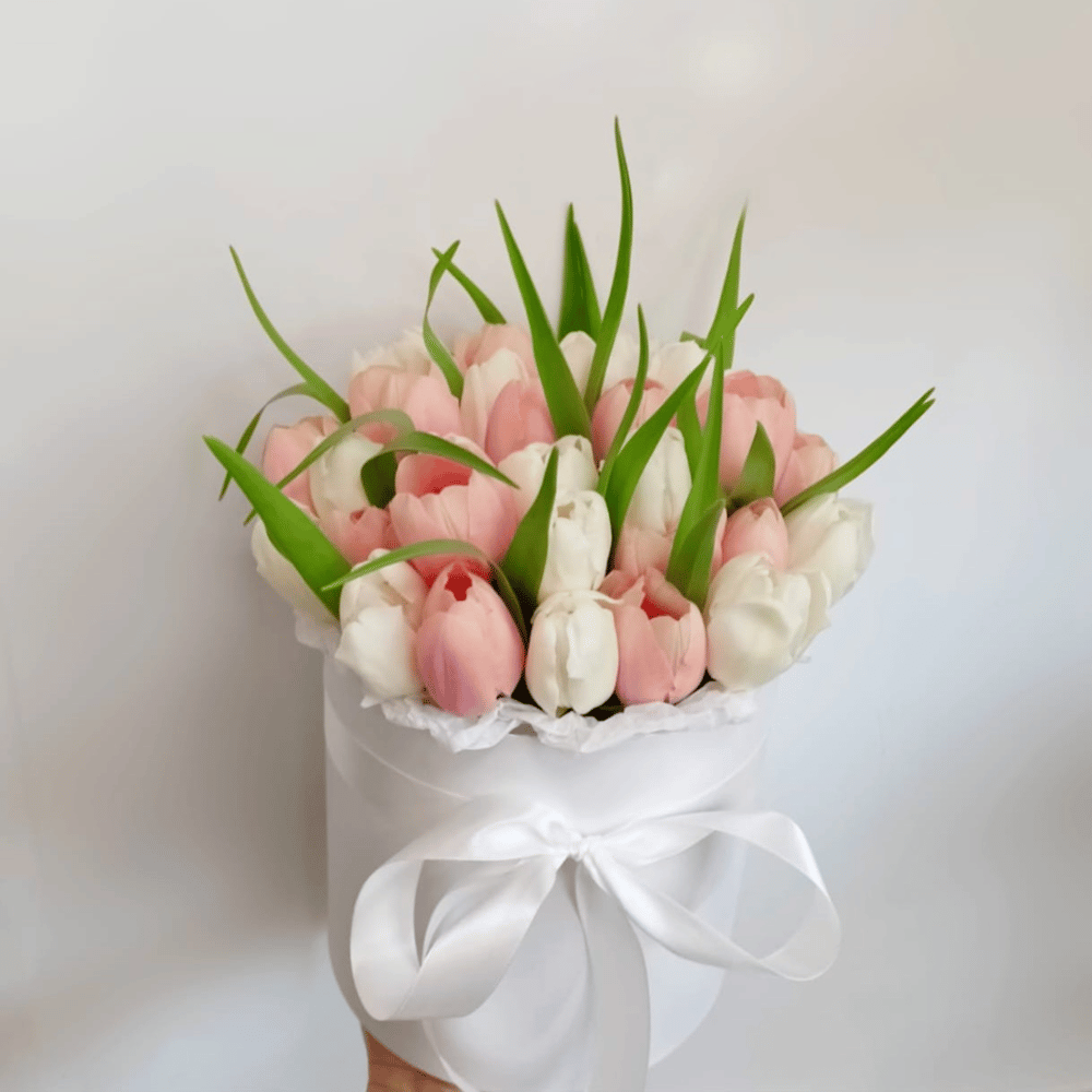 Букет из 35 тюльпанов в шляпной коробке