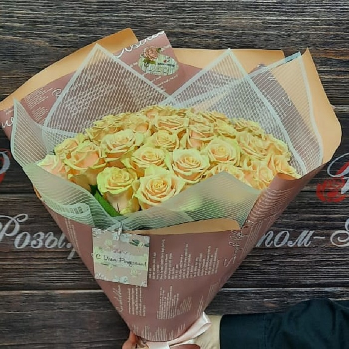 Букет из 39 кремовых роз с оформлением и открыткой. Доставка по городу бесплатно!