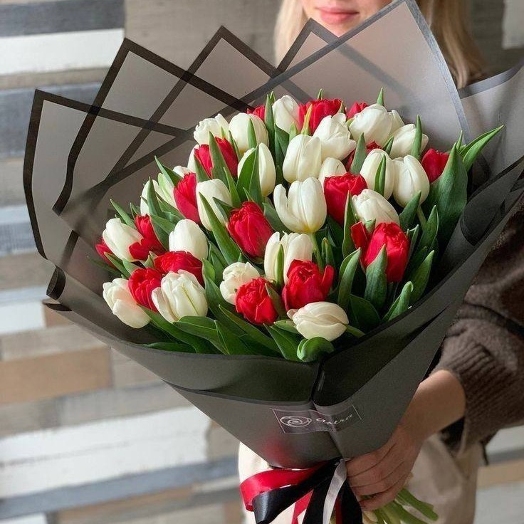 Букет из 45 красно-белых тюльпанов
