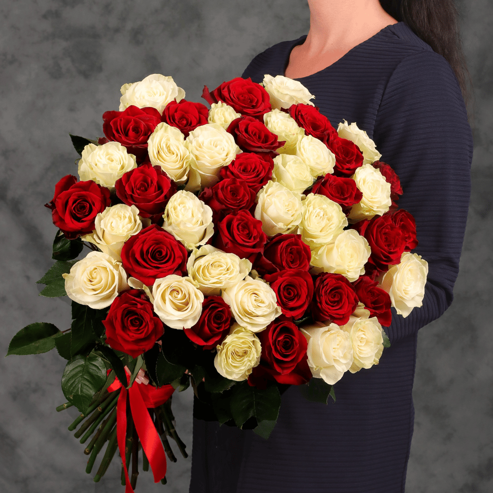Классический букет из 45 красных и белых эквадорских роз 60см с атласной лентой от 2name flowers букет из 45 красных и белых эквадорских роз сорта мондиаль и эксплорер станет прекрасным подарком д…
