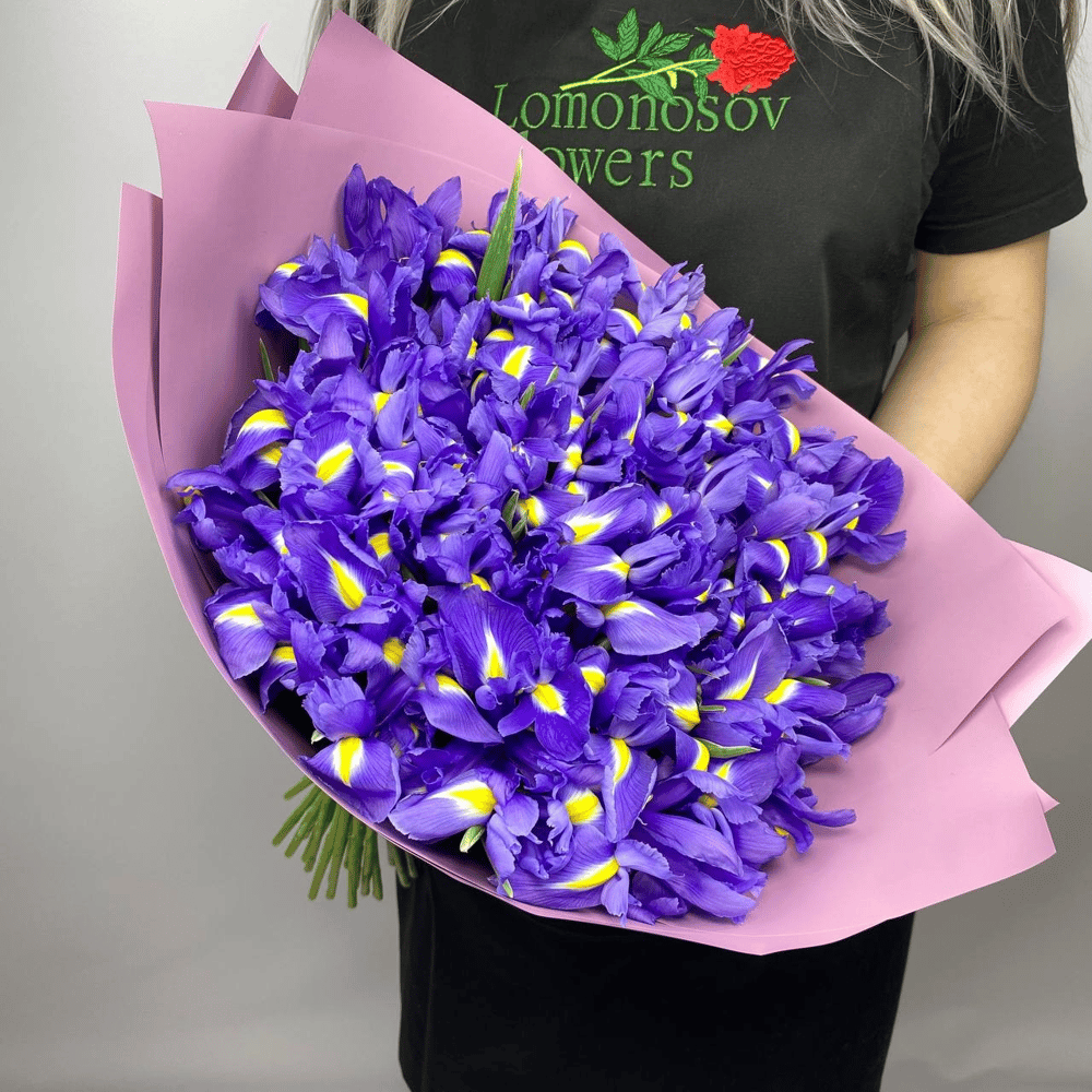 Пышный букет из 49 изысканных ирисов в авторской упаковке. 🎁 В подарок к букету Вы получите: - фирменную открытку с Вашими пожеланиями - инструкцию по уходу за букетом - подкормку для срезанных цветов
