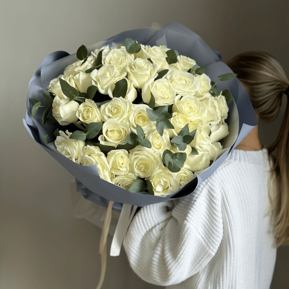Этот изысканный монобукет из 49 белых роз с эвкалиптом - воплощение чистоты, нежности и элегантности. Белые розы символизируют чистоту и нежность чувств, а эвкалипт добавляет букету свежести и изыс...